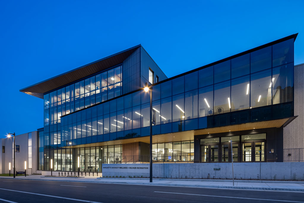The Marquette Wellness + Helfaer Recreation Center is a consolidation of the Helfaer Tennis Stadium and Recreation Center to create a comprehensive wellness and recreation facility. The building hosts campus fitness and recreation facilities, as well as a counseling center and student medical clinic. The center spans five stories, with two multipurpose recreation courts, four tennis courts, four basketball courts, a 25-yard swimming pool, and several studios. Not only is this building a hub for physical wellness, but mental health as well, all fit into an updated facility utilizing natural lighting and sustainable elements.